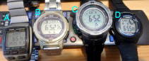 ところで、これら4個の腕時計のうち、BとCは電波時計であり正確に同じ時刻(6時52分15秒)を示している。私がスゴいと思ったのは、電波時計ではないAが6時51分51秒を示していた点で、10数年以上一度も時刻合わせをしていないにも関わらず、24秒しか遅れていないという点だ。いっぽう、拾得後所有権獲得のDは6時55分05秒となっていて2分50秒ほど進んでいる。交通機関を利用する時には事前の時刻合わせが必要。 |