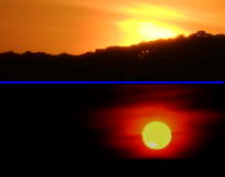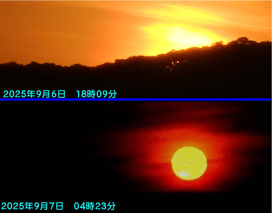 9月7日の早朝、西の空に月の入り直前の月齢14.6の月が見えていた【写真下】。前日に撮影した日の入り【写真上】に比べるとかなり左方向(南方向)にズレていた。 ところで9月8日早朝は皆既月食が見られる(皆既食は02時30分〜03時53分で全国どこでも同時刻)。このことでふと思ったが、皆既月食は地球の影に月が入る現象であるゆえ、「地球の影」が西の地平線に沈む方位は月の入りとほぼ一致するはずである。いっぽう太陽は「地球の影」と180°反対の位置にあるので、日の入りの方位が270°+αであるなら「地球の影」の方位は270°-αとなるはず。皆既月食が月の入りの瞬間に起こった場合は「地球の影」と月の入りの方位は一致するはずだ。 というような仮説を立てて9月7日、9月8日のの日の入りと月の入りの方位をこちらとこちらで調べたところ、