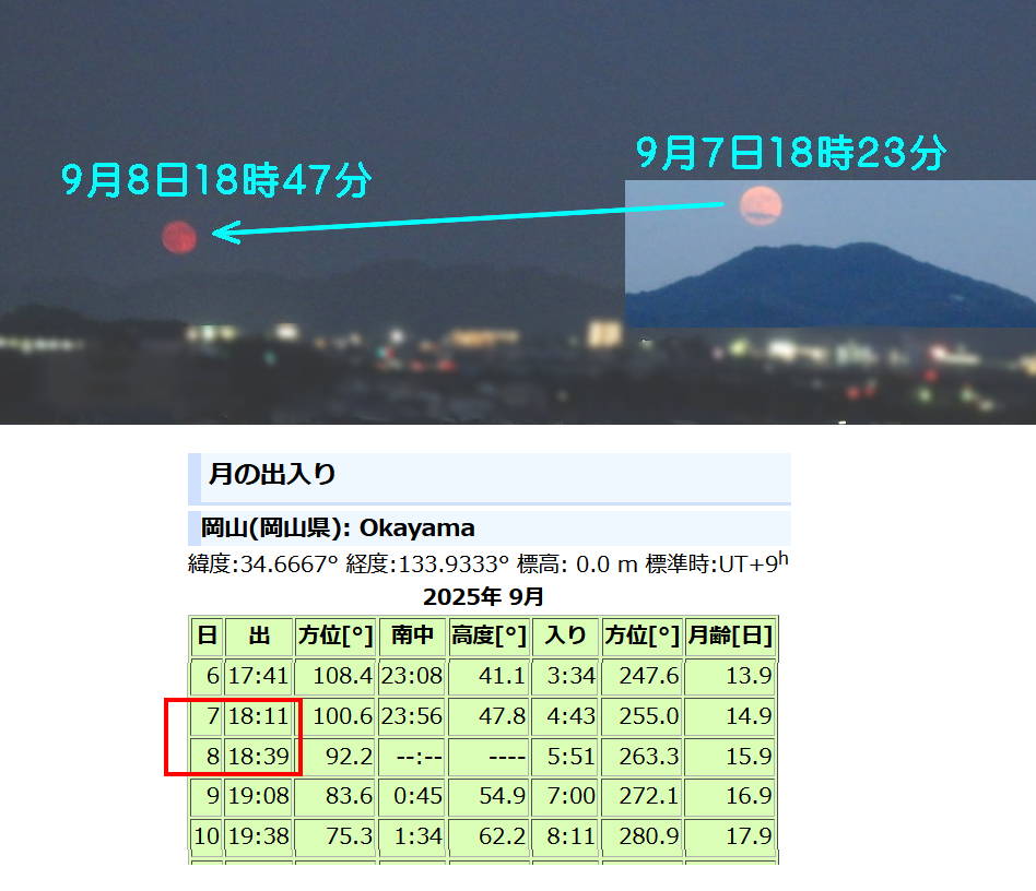 【小さな話題】月の出は毎日どのくらい遅くなるか? 楽天版(9/8)に満月の月の出、深夜の皆既月食、翌日の朝焼けの写真を掲載した。 9月8日にも月の出の写真を撮ろうと思い国立天文台で月の出の時刻を調べたところ、9月8日の月の出時刻は18時39分となっていて前日7日より28分しか遅くなっていないことが分かった。 月の出の日々の遅れは確か50分ではなかったか、もし毎日の遅れが30分だったとすると48日経たないと同じ時刻に月の出にならないため1か月の長さが変わってしまう。ということでさっそくChatGPTに質問したところ、以下のような回答をいただいた。 【質問】月の出の時刻はまいにちズレていますが、最長で何分、最短で何分ぐらい遅くなりますか? 北緯:34.6667°の岡山から観察するものとして教えてください。 【回答】 いい質問です ― 結論を先に書きます。