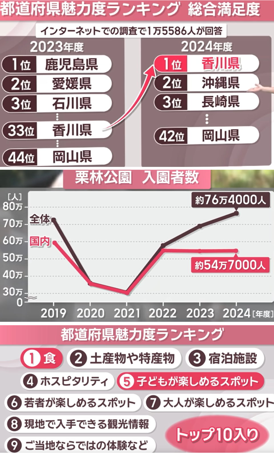 このうち1.については何とも言えないが特定の大都市の回答者が多ければ近隣地域での満足度が高くなる可能性もある。 2.については1位の香川県が91.3、2位の沖縄県が89.4となっていてそれなりに差はついている。しかし5位タイで鳥取県、熊本県、大分県がいずれも88.0、8位タイで山梨県、三重県、鹿児島県が87.0というように、Top10の中の6県が3県ずつタイ、つまり評価値の平均が同じ値になっているところを見ると、数値が僅差になることで順位が大幅に変動するという可能性はあるように思う。 3.についてもよく分からないが香川県が特に注目を浴びるようなイベントは無かったように思う【瀬戸芸なら香川県だが開催は2025年。、朝ドラの舞台で言えば『らんまん』の高知県が考えられるが】 香川県の観光地として私が印象に残っているのは以下の通り。 このうち1.から4.は昨年12月に家族旅行で訪れたばかり。香川が一位になった本当の理由は、『父母ヶ浜』や『天空の鳥居』にあるのではないかと思う。栗林公園は岡山後楽園を凌ぐ絶景だとは思うが、庭園の背景にマンションが見えてしまっているのは何ともガッカリさせられる。景観条例で今後の建築を規制するか、栗林公園側に巨大な目隠し(こちらのようなもの)を設置して全国屈指の日本庭園を守ってもらいたいものだ。 あと、香川県への旅行者を増やすためには瀬戸大橋通行料金の値下げが必須。以前1回1000円で通行できた時には何度も四国へ出かけていったものだ。 最後に香川県が一位になっている項目10選をChatGPTに調べてもらった。 香川県が全国1位の項目(10選)