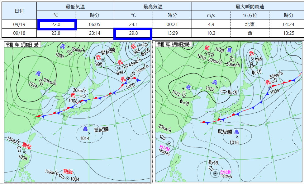 9月18日から19日にかけて秋雨前線が南下し、18日の最高気温は29.8℃で30℃には達せず、また19日の朝の最低気温は22.0℃まで下がった。下の記事参照。 |