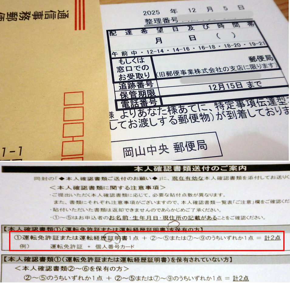 【小さな話題】本人確認されるのも容易ではない 12月初め、ガソリンスタンドの勧めで新しいクレジットカードの申し込みをした。スマホ、運転免許証、銀行通帳を持参していたのでその場で手続が完了。あとは自宅にカードが送られるのを待つだけだと思い込んでいたのだが、12月下旬になってもカードが届かない。妙だなあと思ってカード会社に電話したところ、郵便局から送られているはずの『本人限定受取郵便物等(特伝型)』に対して私が返事を怠ったため、保管期限切れでカード会社に送り返されてきているという回答であった。 最近の事情はよく知らないのだが、従来、重要な郵便物は書留や簡易書留で送られてくるものであり、本人確認はその際に配達員に運転免許証を提示するだけで受け取ることができていた。なので、今回も、カード会社から直接クレジットカードが郵送されてくるはずで、不在であった時は再配達依頼の紙が玄関ドアに入れられているはず、それが無かったので単にカードの発送が遅れているものだと思い込んでいた。 ところが実際はそうではなくて、