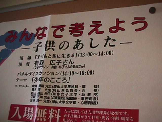 980302(月) [一般]「○○さんの母」という呼び方 昨日のこの欄で有森裕子さんのことを書いたが、きょうたまたま、文学部の掲示板に、そのお母さんの有森広子さんの講演のポスターが貼ってあるのに気づいた。ご存じのように有森さんは、岡山市出身。週刊誌ネタにされても、その人気は衰えない。 ただ、そのポスターには、