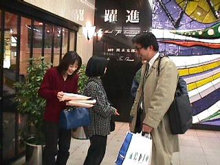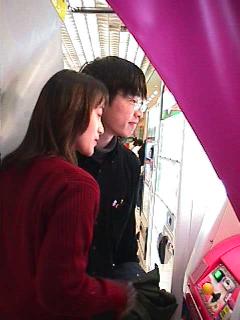 ![]() | れっきい氏とのプリクラ写真の夢がかなって満面の笑みを浮かべる、こやまん氏。いっぽうのれっきい氏は、日記界のプリクラの女王にふさわしく、冷静沈着。馴れた手つきでボタンを操作する。 |