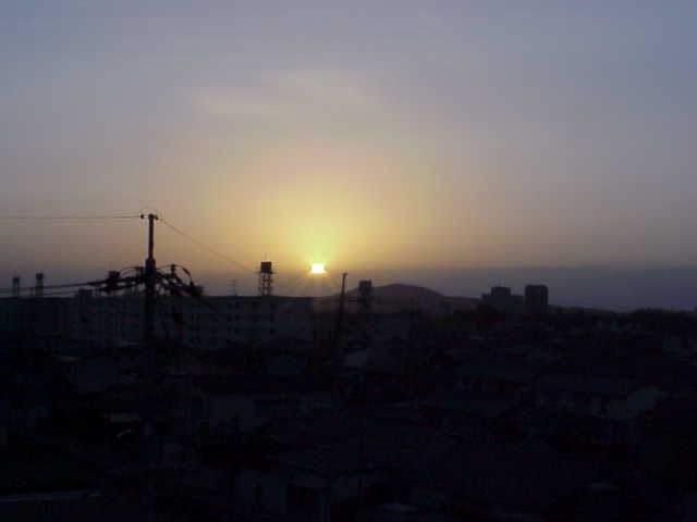 岡山では元旦も1/2も朝のうちは雪雲が垂れ込めていて日の出を見ることができなかった 。1/3の朝も東の空には低い雲が出ていたが、空全体は晴れ渡り、やっと「初日の出」を迎えることができた。 |