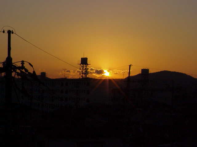 昨日に引き続いて、日の出の写真(1/4撮影)。相変わらず雲の切れ目から。 |
