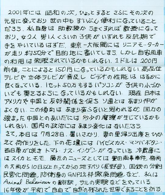1985年の夏には私は愛知県犬山市に住んでおり、まだ就職はしていなかった。オーバードクターという不安定な身分ゆえに何度も転居することを予想して、宛先は出身大学の研究室気付としておいた。親切にこれらの手紙を転送してくれた研究室の方にまずはお礼を申し上げたいと思う。じっさい私たちは、このあと4回も引越をしている。 私がじぶんに宛てた手紙には21世紀についていくつかの予想が記されてあった。その部分について、当たっていた予想を青字で、外れた予想を赤字、当たったか外れたか判断の難しい予想を緑字で記すと次のようになる 2001年には昭和の次、ひょっとするとその次の元号に変わっており、世の中もずいぶん便利になっていることだろう。私自身は助教授かうまくすれば教授になっており、女2人 男1人くらいの子供がいずれも反抗期で手をやいているはずだ。東京−大阪間にはリニアモーターカーが走り約50分で目的地に着いてしまう。しかし自家用車の利用は制限されているかもしれない。 1ドルは200円前後、ことによると150円になっているかもしれない。高品位テレビや立体テレビが普及し、ビデオの性能ははるかに良くなっている。パソコンが子供の小づかいでも買えるようになっているかもしれない。現在日本はアメリカや中国と友好関係を保ちソ連とはあまり仲がよくない。この傾向はあまり変わらないと思われるが、国力の強まった中国とのあいだには多少の摩擦が生じているかもしれない。国内の政治にはあまり変化はないだろう。予想のうち当たったのは5箇所、外れたのは7箇所であり外れた予想のほうが多かったけれど、結構当たっていたのではないかと自画自賛している。 外れた箇所について簡単にコメントしておくと