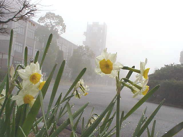 時計台近くの水仙、濃霧バージョン(2/22撮影)。霧の風景自体は条件が揃えば一年中見られるが、水仙との取り合わせは今だけに限られる。 |