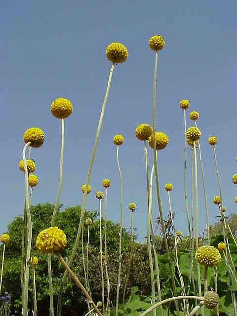 ゴールドスティック。オーストラリア原産のキク科の多年草。昨年秋に株分けして植え替えたところ、たくさんの花をつけた。足元から上を見上げるような角度で撮影。黄色い風船が浮かんでいるように見えませんか? |