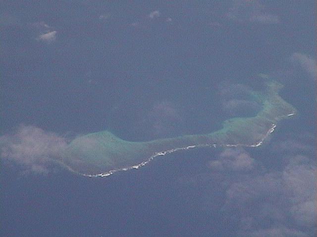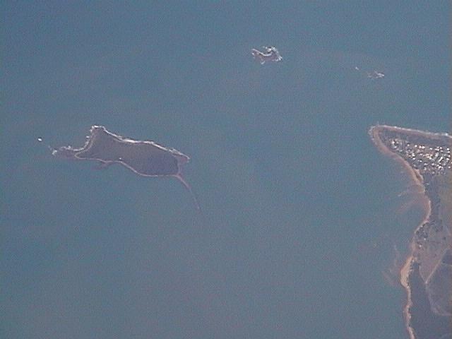 シドニーから関空までの飛行機は日本時間の10時半すぎに現地を飛び立ち、19時50分頃に関空に到着した。ちなみにこの便は、JL778便(カンタス航空とのコードシェア便だが、日航機が就航していた)。往路の便名が、ラッキーナンバーの777便となっていた。 指定された席は最も眺めの悪い真ん中の位置にあったが、空席が多く離陸直前に窓際の席に移動。南太平洋やニューギニアの様子を眺めることができた。 離陸後1時間50分ほどはオーストラリア大陸の東部上空を進む。変わりばえのしない平坦な土地が続いた。その後、ケアンズのあたりで珊瑚海(グレートバリアリーフ北端)に出る。 写真上段左は、その直後に見た島で、私の世代ならお馴染みの「ひょっこりひょうたん島」によく似た形をしていた。地元では何と呼んでいるのだろうか。右側の陸地はオーストラリア大陸の最後の部分である。 それから1分も経たないうちに、今度は、日本列島が沈没しかかっているような面白い形の島が見えた(写真上段右)。おそらく左上方向を中心とする珊瑚礁の一部なのだろう。
