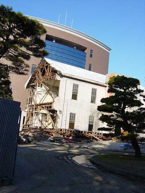 岡大の旧事務局[旧日本軍第17師団(大正14年廃止)司令部・歩兵第33旅団司令部]の一部の移送が始まった。写真左は1/8朝撮影。右は1/9の昼食後に撮影。このように老朽化した木造建築物を丸ごと動かしてしまうとは、日本の技術もスゴイもんだ。 |