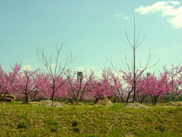 岡山大学の桃源郷? 農学部農場内の桃畑が花盛りとなっている。桃の節句や「桃のお花も綺麗に咲いて、もうすぐみんなは一年生」という歌詞に象徴されるように、桃の花は3月に咲く花というイメージが強いが、果物栽培のための桃の木は、4月上旬に咲く品種が多いように思う。 |