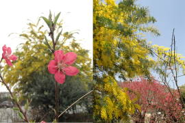ハナモモとミモザのコラボレーション。写真左は「ハナモモ一輪とミモザ」、写真右は「ハナモモいっぱいとミモザ」。 |