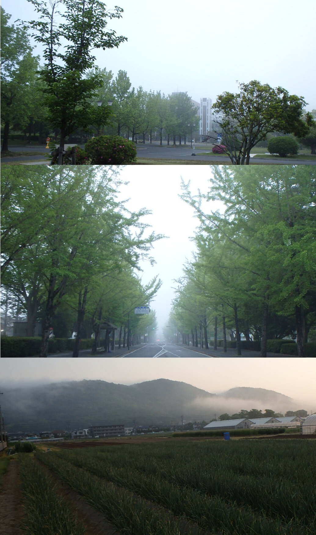 5月9日の早朝、岡大構内はうっすらと霧に包まれていた。いつもの散歩コースを変更し、時計台前まで行ってみた。写真は上から、時計台前、岡大・南北通り(岡大西門から南方向)、農学部農場と半田山。 |