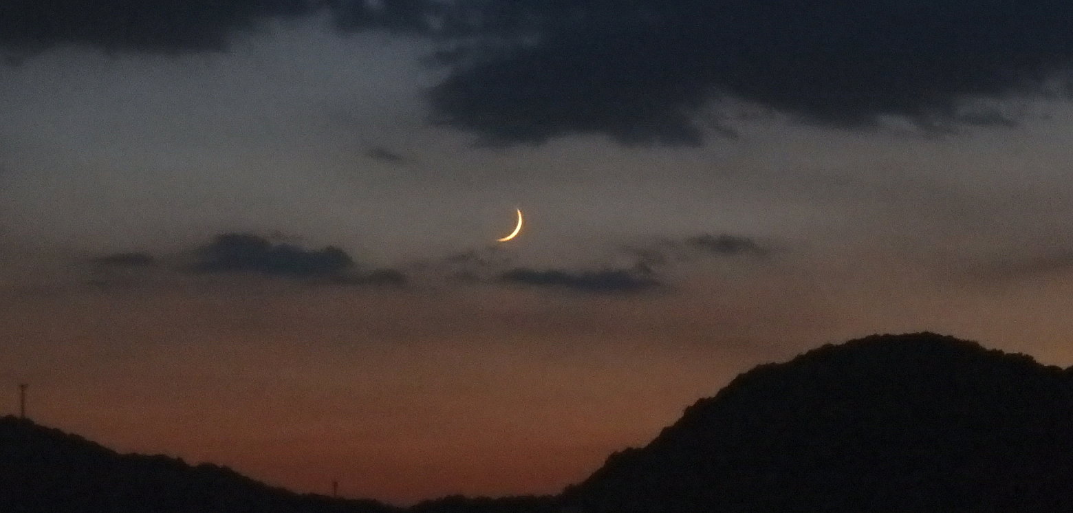 7月6日の20時すぎ、北西の空に月齢2.0の月が見えた。細い月のわりに明るく光っていた。 |