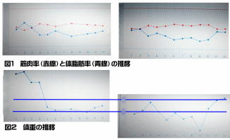 健幸ポイント参加後2年間の、筋肉率、体脂肪率、体重の推移。↓の記事参照。 |