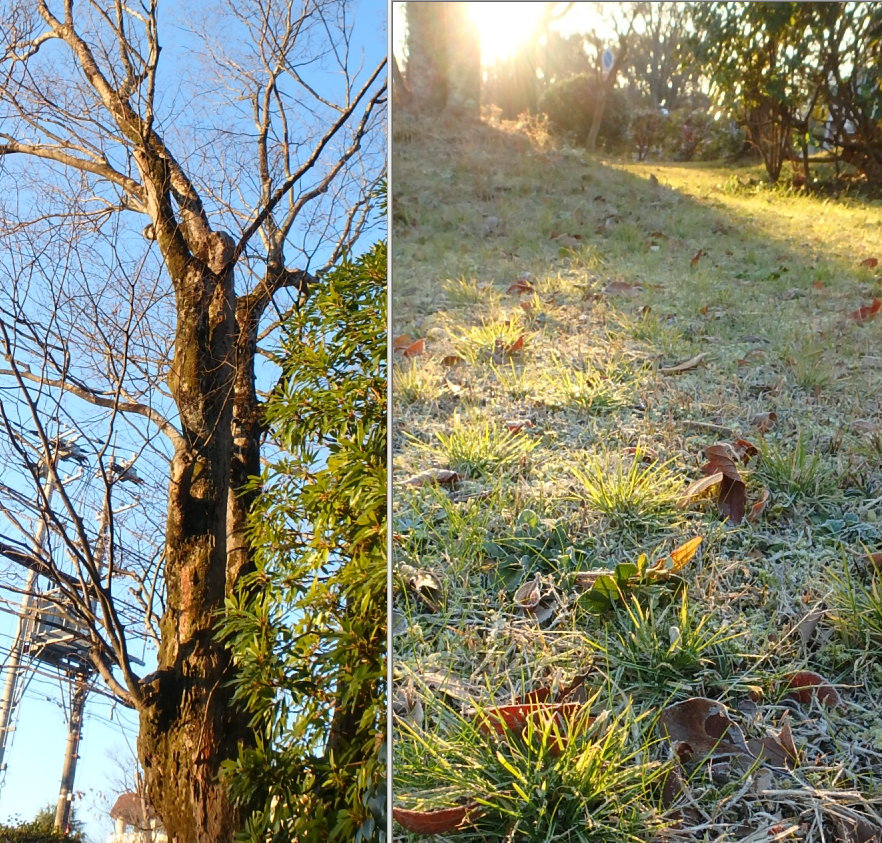 朝日に照らされるケヤキと芝地。1月23日の岡山の日の出時刻は7時08分であり、日の出が最も遅い1月5日から1月12日の頃の7時12分より4分ほど早くなっている。 私の場合、毎日ほぼ同時刻に出勤しているので、わずか数分の差であっても朝日の射し込み方は大きく変わってくる。 |