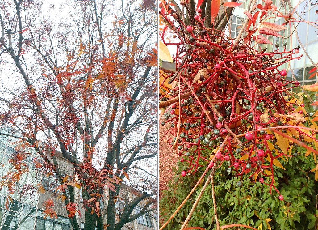 岡大・時計台脇のカイノキは、昨年と異なり、今年は赤く染まることなく落葉している。原因は、両脇2本ともメス樹であり実がいっぱいなったことによる。