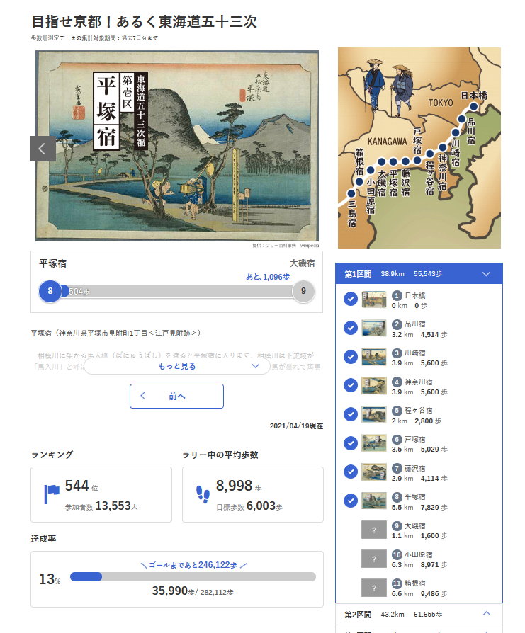 おかやまケンコー大作戦の一環として、バーチャルウォーキングラリー〜目指せ京都!あるく東海道五十三次〜という企画が始まった。おかやまケンコー大作戦は「1日4,000歩以上で1ポイント、6,000歩以上で3ポイント、8,000歩以上で7ポイント」などの基準で歩数ポイントが付与されているが、これとは別に、東京日本橋から東海道を歩いて京都を目ざすというイベントが4月15日から開始されたものである。ゴールまで到達しても、わずか10ポイントの奨励ポイントが付与されるだけだが、日々のウォーキングで五十三次をどこまで歩けるのかが具体的に分かり、やり甲斐が出てきた。 4月15日から18日までの合計歩数は3万5990歩となっており、554位/13533人、平塚宿まで到達と表示されていた。それにしても、岡山市内で13553人もの多くの人たちがケンコー大作戦に参加しているというのはスゴい。 |