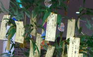 生協マスカットユニオン(北福利施設)入口に、恒例の七夕飾りが設置された。「世界平和」とか「コロナ終息」ではなく、個人的な願い事が多いように見受けられる。 |
