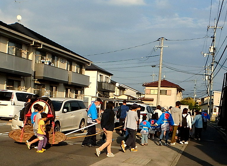 ウォーキングの途中、近隣の町内会による、だんじり祭の行列を見かけた。かつて私の子どもたちが参加していた津島地区のお祭りとは異なり【2000年10月21日の日記参照】、 、