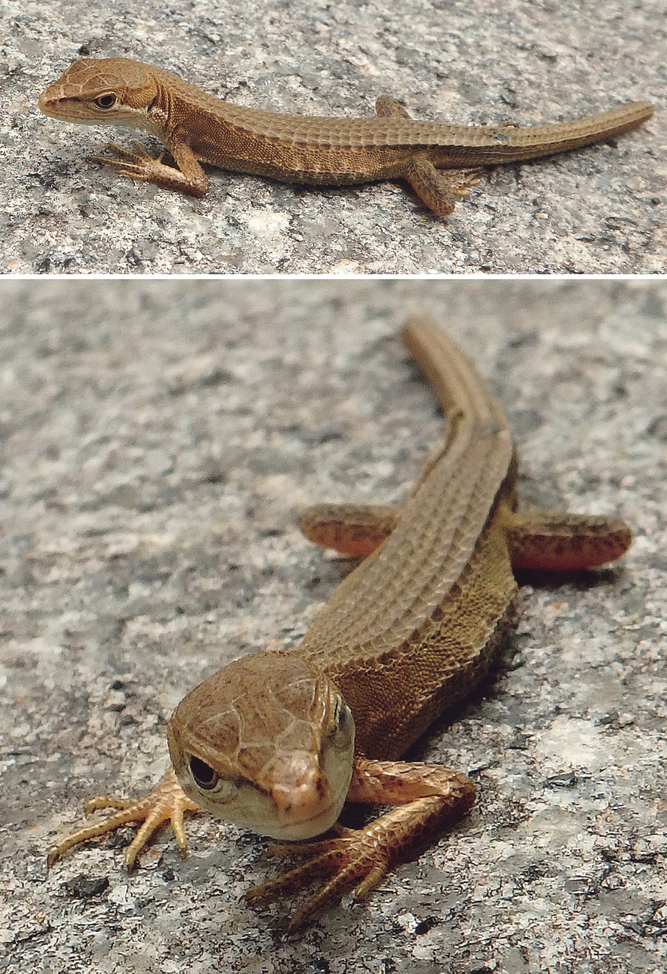 半田山植物園で見かけたニホンカナヘビ。普段は近づこうとすると素早く逃げてしまうが、時たまじっとしていて接写できることがある。 なお、こちらに2匹が交尾している写真あり。 |