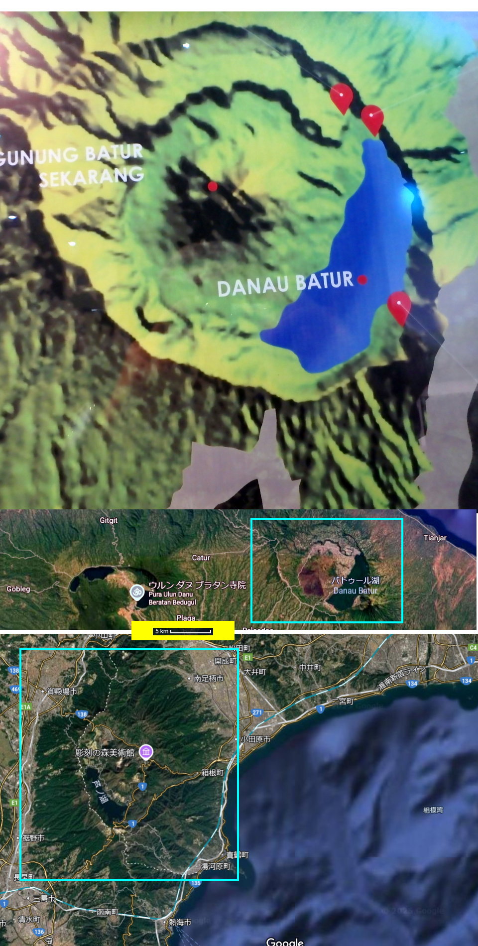 まとめると、**バトゥール火山は今も活発に噴火を繰り返す「生きた火山」**、一方で\*\*箱根火山は温泉や観光に恩恵をもたらす「休みつつ息づく火山」\*\*といえるでしょう。 同宿尺で比較した限りでは箱根火山のほうがはるかに規模が大きいように見えたが、カルデラ自体はいずれも10km程度であるようだ。外輪山の外側の裾野の広がりは箱根のほうが広いが、カルデラ内部の広さは同程度かもしれない。 なお、ジャワ島・ブロモ山と阿蘇山の比較は7月21日の日記にあり。 |