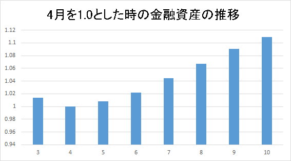 **単純推定では、今年4月→10月の間に「家計(個人)の金融資産」は市場価格変動だけでおよそ+約8.8%増加したと見積もれます。**(以下に計算と前提を示します)