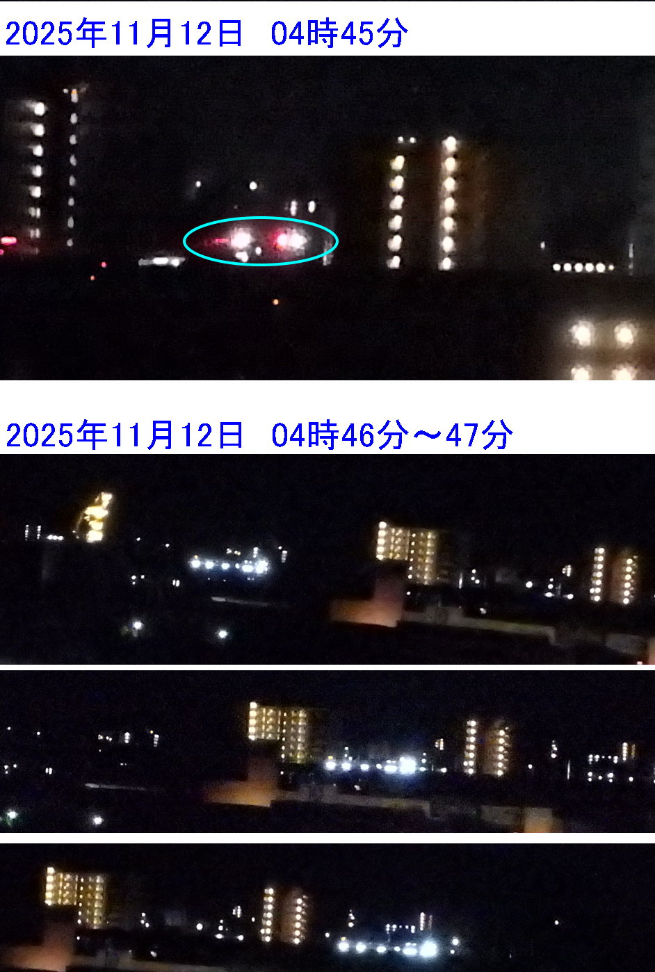 新幹線始発より1時間以上早い04時45分~47分頃、線路上を西方向に走る作業車(保守用車)。この日は、少なくとも2種類が1~2分の間隔を置いて走行していた。この時間帯に作業車が通ることは半年程前から知っていたが、今回初めて撮影に成功した。 |