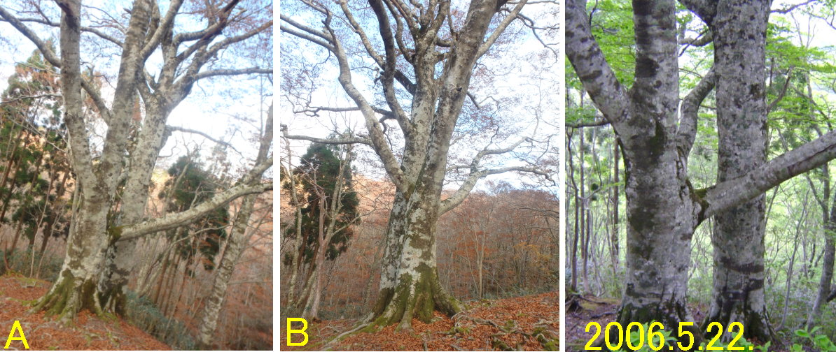 11月15日(土)、久しぶりに県北の森林公園を訪れた。写真は2本が抱擁しているように見えるブナ。 この2本は2006年5月22日の日記でも取り上げており、19年半ぶりとなる。豪雪にも耐えて成長を続けているのが羨ましい。 当時の日記では『夫婦ブナ』と呼んでいたが、森林公園内には他にも『夫婦』と呼ばれるようなブナがあることから、それらと区別するために今回から『ぬくもりブナ』と呼ぶことにしたい。 |