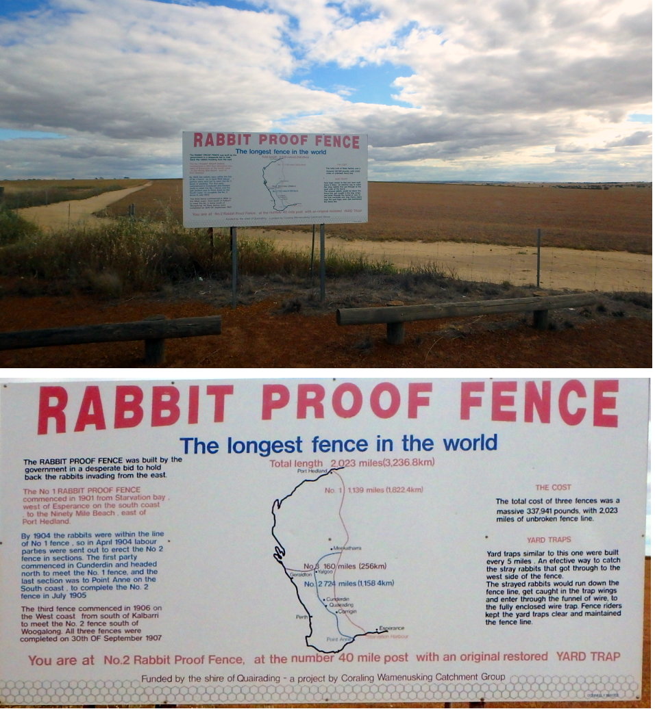 パースからウェーブロックに向かう途中で立ち寄った『ラビット・プルーフ・フェンス』(RABBIT PROOF FENCE)に関する説明看板。世界最長のフェンスの歴史、建設費用、およびウサギを捕獲するためのヤードトラップについて説明されている。
