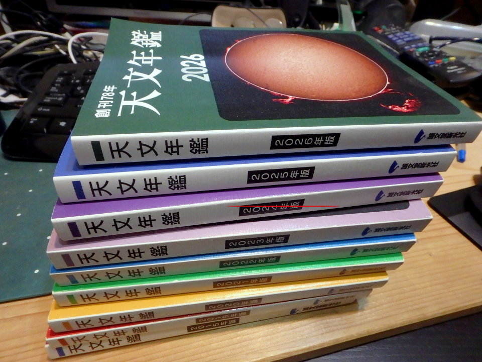2026年の『天文年鑑』(誠文堂新光社)を購入した。「1500円+税」となっており、2025年版の「1364円+税」から値上げされた。 この本は1963年から欠かさず購入しており、今回で64冊目となる【写真右参照】。 なお、2026年の任意の月齢を知るために必要な「特別の数α」は「9」になる。2009年1月22日に記した計算法を2026年の数値に合わせた上で再掲すると以下のようになる。 月の月齢を知る簡便な方法として「(m+d+α) mod 30」という計算法がある。mは月(但し1月から5月は、1、2、3、4、5の代わりに2、4、2、4、4を代入。「西に洋々日が沈む」と覚える)、dは日、αはその年に特有の数で今年は9(毎年11ずつ増え、30を超えたら30を減じた値とする)。というように実際の月齢との誤差は±1以内におさめることができる。海外旅行先で月明かりの無い美しい星空やオーロラを眺めたい人は知っておくと便利。 |