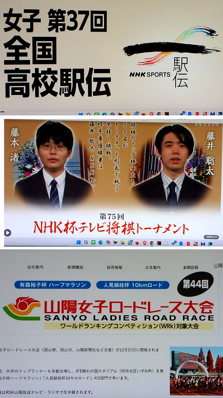毎週日曜日の午前中は『NHK杯テレビ将棋トーナメント』を視聴しており、今回は藤井六冠に藤本七段が挑むという注目の対戦であった。 いっぽう、この日は12月の第3日曜日にあたっており、ほぼ同じ時間帯に、全国高校女子駅伝、また民放ローカル番組では山陽女子ロードレースの中継があった。とりあえず複数の録画機で3番組を録画し順番に再生視聴した。 山陽女子ロードレースは近隣の運動公園で行われるためウォーキングを兼ねて、コース沿道やゴール地点の陸上競技場【←ネームライツで『カンスタ』とか『シティライト』というように呼称が変わるため覚えられないが、現在は確か『JFE晴れの国』何とかになっていたと思う】まで足を運んだこともあったが【福士加代子選手が出場した時など"】、今回は雨が降っていたため自宅で観戦した。 なお、高校駅伝では岡山県・倉敷高校が男子3位、女子6位という好成績をおさめた。ちなみに倉敷高校は私立高校。岡山市にある岡山高校も私立高校。 |