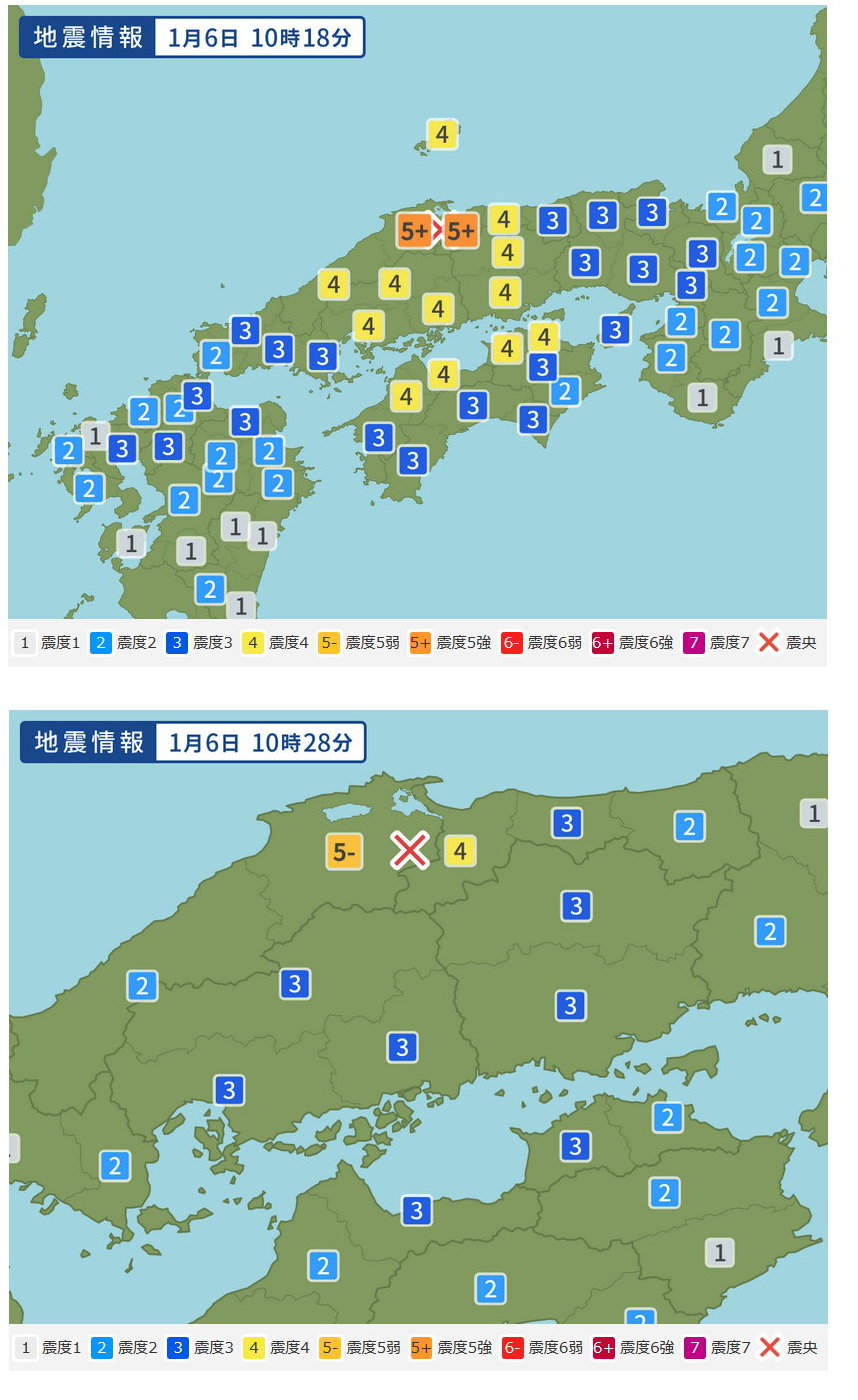 1月6日の10時過ぎ、妻の運転する車で移動中、完成したばかりのマンションが目に入った。私が、 ●最近の新築マンションは耐震設計のためなのか、バルコニーが厚い壁に仕切られて見晴らしも風通しが悪くなっているように見える。他の地域ならともかく、大地震が起こりにくい岡山に限ってはあそこまで頑丈に作らなくてもエエんじゃないかな。 とつぶやいた直後、突然、妻と私のスマホと車のラジオから一斉に緊急地震速報が鳴り出した。交差点で信号待ち停車となったところで車が上下に揺れ、また信号機も揺れているのが見えた。 緊急地震速報をスマホで受信したのは今回が初めてだったが、まるで私の「岡山では大地震は起こりにくい」というつぶやきに応じたかのようなタイミングとなった。ひょっとして私には予知能力があるのか? と思ったが、2回目の地震の時は岡山では緊急地震速報は発せられず、車が走行中だったためか揺れにも気づかなかった。 |