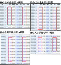 当初この「足踏み」に気づいた時は、私は日の出時刻のほうが日の入りより足踏みしやすいのではないかと思ってしまった。その原因は、上掲の表の中の「日の出が最も遅い期間」と「日の出が最も早い期間」のところだけを見ていたためであった。これら2つの表では、日の出時刻は殆ど変わらない(=足踏み)のに対して、日の入り時刻は日々変化していることが読み取れる。 しかしそれは日の入り時刻が極大、極小になる時期とはずれている。じっさい画像の下段に示す『日の入りが最も遅い期間』と『日の入りが最も早い期間』に目を向ければ日の入り時刻にも足踏み期間があることが見てとれる。 なお、最早日と最遅日が日の出及び日の入りでそれぞれ異なる理由については以前にもこの日記で取り上げたことがあるので(←あるはず)、ここでは省略する。 このほか、日の出と日の入りの定義「太陽の上端が地平線または水平線に一致する時刻」は「足踏み現象」についてはChatGPTから以下のような回答をいただいた。 定義に用いられている「太陽の上端+大気差(屈折)」は、日の出・日の入りの絶対時刻を一様にずらすだけで、「足踏み」や「目立った変化が起きる/起きない」という性質そのものには、原理的な影響はありません。 また南半球ではどうなるか?については、以下のような説明をいただいた。 「日の出と日の入りのどちらが足踏みしやすいか」という構造は、北半球・南半球で本質的に同一であり、単に“起きる月が半年ずれる”だけです。 最後に、 ●日の出の時刻と日の入りの時刻ではどちらが日々の変化に気づきやすいか? について。 ChatGPTも指摘していたが、多くの人、特に日中に学校に通ったり通勤している人たちにとっては日の入り時刻の変化のほうが気づきやすい。岡山で言えば時日の入り時刻は16時53分から19時21分のあいだで変化するので、部活や帰り道の明るさに影響を与える。いっぽう日の出時刻は04時50分から07時11分のあいだで変化するので、大概の人たちはすでに明るくなってから通勤・通学に出かけており違いを感じにくい。 |