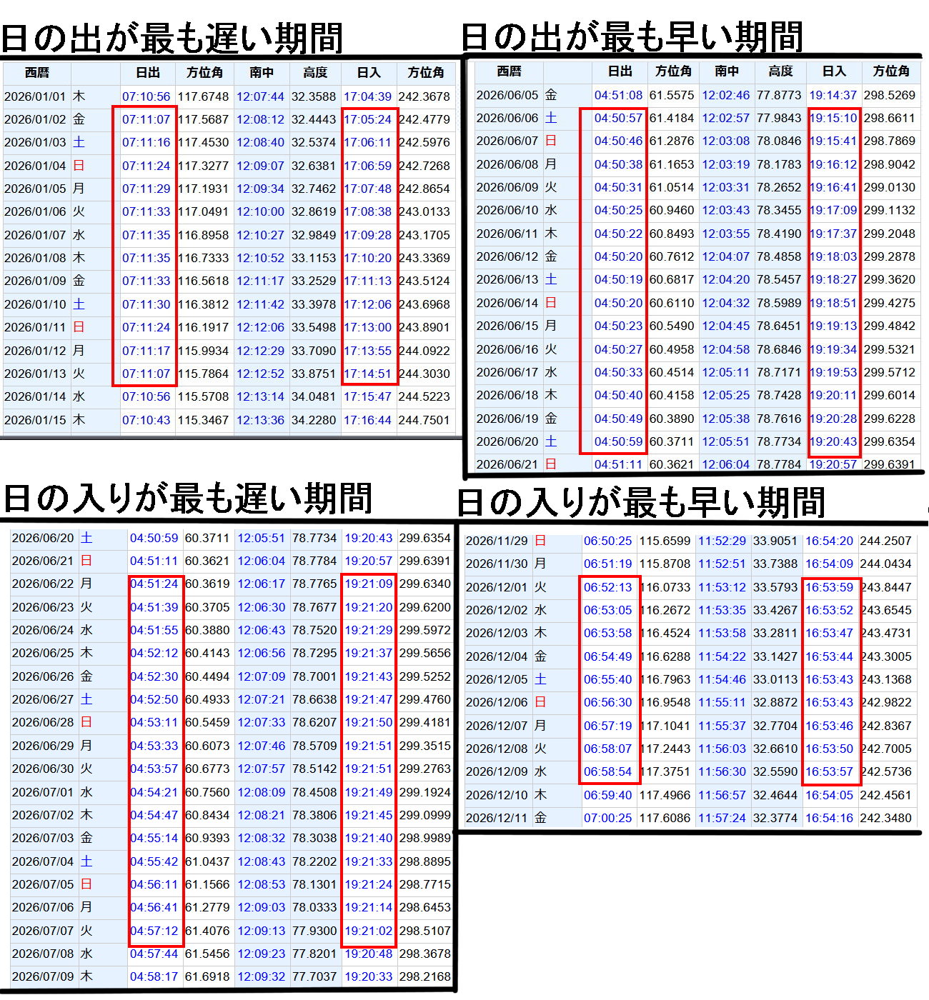 昨年10月頃から、晴れている日は毎日、日の出と日の入りの写真をXにポストするようになった【10月16日の楽天版参照】。日の出時刻も日の入り時刻も日々変化するのでアラームのセットを修正する必要があるのだが、季節によって日々の時刻が殆ど変わらない時期があることに気づいた。岡山の場合、