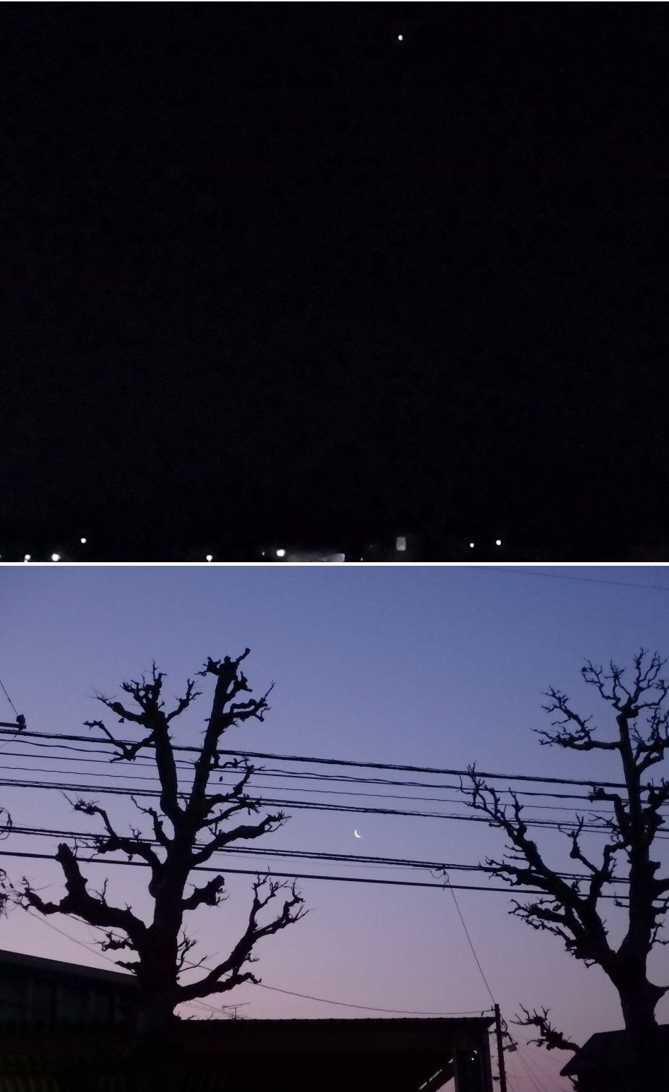 1月14日の昼前に某待ち合い室でテレビを見ていた時にふと、元日の夜明け前に金星が見えるかどうか疑問が生じた。さっそくChatGPTに以下の質問をさせていただいた。 【質問】 今年の元日の夜明け前に金星を見たという話を聞きました。しかし金星は1月7日に外合となるため太陽に近すぎて見えにくいと思います。方角は180°異なりますが、見えていた明るい星は木星ではないかと思うのですがいかがでしょうか? いただいた回答は以下の通り。なお左の写真は、1月15日に撮影した、夜明け前に北西の空に輝く木星と、南東の空に輝く月齢25.8の月。 ご指摘の通り、**2026年1月1日の夜明け前に「金星」を見たという話は実際にはあり得ない可能性が非常に高い**です。理由と判断根拠を整理します: