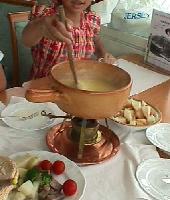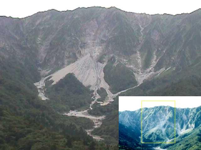 980815(土)[旅行]大山北壁の崩落、蒜山様変わり 梅雨前線が中国地方に横たわるという異常な気圧配置であったが、大雨に見舞われることもなく、3日目の朝を迎えた。曇りがちながら、3日目にして頂上付近が初めて見えた。7/26のラジオニュースで、北壁で大規模な崩落があった聞いていたのでさっそく観察する。この写真が崩落現場。右下の写真は95年8月下旬に豪円山の同じポイントから撮影したもの。三角形のがれきが覆いかぶさっているところがよく分かる。 この三角形のがれきの左下側の沢は、3年前にユートピア小屋と三鈷峰に登った帰りに下ったところである。今でも通行できるのだろうか。 大山からは環状道路と旧有料道路(蒜山大山スカイライン)を通って蒜山のジャージーランドに。4〜5年前に来た時は、5〜6席だけの小規模なレストランだけでしかも季節によっては休業していたと記憶しているが、駐車場が2倍に拡張され、レストランもガラス張りの数十席の大規模なものに様変わりしていた。20分ほど順番待ちのあと、チーズフォンデュを賞味。一人前2500円。写真は二人前の分量。 この建物の裏手には広大な牧場が広がる。ここも花壇やベンチなどが整備されていて観光客向けに様変わりしていた。写真は、ブルー・サルビア(ファリナセア)を前景にした上蒜山(左)と中蒜山(右)。中央やや左にジャージー牛が見える。