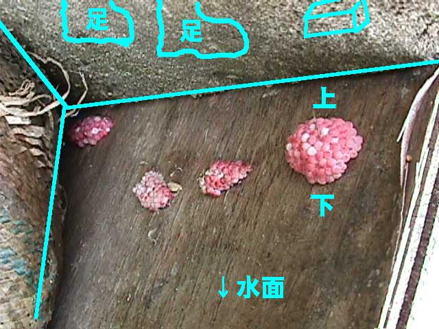 余談だが、左側の卵の写真を拡大したとき、コンクリートのトンネルの天井方向を見上げた写真で、左上の卵の所がいちばん引っ込んだ角、上のコンクリートは天井部分であるというように見えた方が多いのではないだろうか。じつは私自身、じぶんで撮影しておきながら、最初は、あれ、こんな場所を撮ったかなあと首を傾げるほどであった。で、本当の位置関係はこちらのようになる。つまり、上のコンクリート部分が歩くところで、卵が産み付けられているのは側面、左奥が一番出っ張っているのである。この手の錯覚は、知覚心理学ではよく取り上げられるようだ。例えば、月のクレーターの写真を上下逆さにして見せると、凹凸が逆に見えることがある。この写真の場合、一番出っ張っているはずの左上の角の部分が、土嚢の陰で暗くなっているので、何となくへっこんで見えてしまうのだと思う。