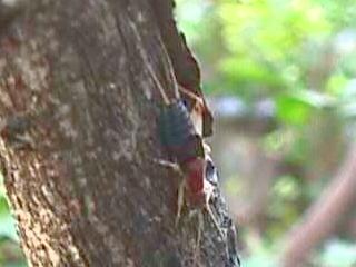 東京の実家の庭で見つけたコオロギの仲間。昼間から羽をこすりあわせて小さな「チッ、チッ、チッ」というように鳴いていた。図鑑で見る限りでは「イソカネタタキ」によく似ているが、解説では「海岸の低い木や草の上に住む」(学研『オルビス 学習科学図鑑 昆虫2』ISBN4-05-104302-9)となっていて、山の手に住むのかどうかは不明。どなたか正確な種名をお教えいただければ幸いです。 |