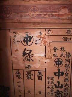 子供の頃はまだプラスチックなどというものは普及しておらず、毛織物の衣類はこのお茶箱に入れて保存していた。いまのような防虫剤や防かび剤も無く(樟脳はあったと思う)、虫干しが重要な年中行事に入っていた。写真のお茶箱には「静岡縣小笠郡中新田 中山商店」という表示がある。電話の左側に「電畧(略)ナカ」と書かれてが、この用途は不明。電報で発注をする時に略称として使える文字列という意味なのだろうか。 |