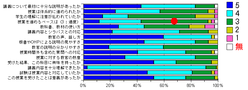 990405(月)[教育]授業内容について学生から評価を受けるわたし 新年度になって初の出勤。大学では事務官が3年間程度で部署を代わる慣行があり、この時期に事務室を訪れるとスタッフの半分以上が新しい方に交代していて驚くことがあるが、最初に訪れた某係は昨年度と同じスタッフであるそうだ。もっとも、昨年来、事務官定員大幅削減にともなって業務の本部集中化・一元化が進められ、それに伴って事務官一人一人の負担が相当に増えているらしい。 きょうはたまたま同僚教官が、新入生のオリエンテーションを行う教室番号を尋ねてきた。事務に電話したところ「配布資料に書いてあるはずですよ」と言って教えてくれなかったとか...。ま、もともと事務官は教官の部下でも秘書でも無いんだが、これからの時代は、事務官に時間的負担をかけることの無いよう、教官側のココロ配りも必要になってくるのだろう。 今週後半からはオリエンテーションなど新年度の行事、来週からはいよいよ授業が始まる。今日はもっぱらその準備、それに加えて、投稿論文改稿中の留学生への執筆指導、新卒論生からのテーマについての相談など忙しい一日となった。 そんななか、新年度授業の参考にするため、前年度一般教育教養科目「こころの科学」で実施された学生の授業アンケートの結果をながめる。これは、大学審議会答申を先取りする形で、岡大の全学教務委員会が「個々の教師がその結果を、真の学生像の知悉と授業の改善に役立てることを目的」として企画したもの。授業中に各教官が質問アンケートを配る。自由記述欄以外はマークシートに回答され、各講義別に機械的に処理される。実施するかどうかは教官の自主的な判断に任されているが、実際には785科目、のべ回答者数2万8000人にのぼったというから、かなりの教官が実施を希望したものと推測される。 まず、この図は、各質問項目のうち、私の教え方についての回答分布を図示したもの。但し、質問文は長谷川のほうで簡略化してある。回答は全般に5段階評価となっており、「5」が最も望ましい評価、「4」はこれに準ずる評価、「3」はどちらとも言えない、「2」は、やや望ましくない評価、「1」はもっとも望ましくない評価となっている。一例を挙げれば、「最初にこの講義の説明が十分にありましたか」の問いに対して、「5」は、「説明が十分にあった」、「4」は「どちらかといえばあった」、「3」は「どちらともいえない」、「2」は「どちらかといえばなかった」、「1」は「説明が無かった」となっている。つまり、図の中の青と水色の比率が多ければ、受講生から望ましいとの評価を受けていることになる。但し例外的に、「教官が授業を進めるペースはどうでしたか」という問いについては、「3」が適度となっており、「5」は「速すぎる」、「1」は「遅すぎる」というように番号がふられている(図中、●印で示した部分)。 次に、この図は、私の授業に対する評価をアンケートが実施された教養科目全体の平均値と比較したものである。上にも述べたように、「教官が授業を進めるペースはどうでしたか」の問いだけは、「3」が適度となっており、数値が多いほど望ましいというわけではない。 全体を見渡してみると、私の授業は相対的に望ましい評価をうけており、ひとまず合格点をいただいたといってよいだろう。特に、「教官の声、話し方」、「質問への対応」、「教官の熱意」、「授業を受けた結果、この科目に興味をもった」、「この授業を受けたことは意義があった」などの項目で高い評価を受けたことをたいへん嬉しく思っている。そんな中、反省点としては、学生側の理解に対する配慮と、教科書や教材の使い方についてのいっそうの工夫が求められている。新年度の授業で改善していきたいと思っている。 学生の授業評価については、この科目だけについての絶対評価を重視するか、それとも類似の教養科目の中での相対評価を重視するか、見方が分かれるところだろう。もし相対評価を重視するならば、5段階評価というのはほんらい順序尺度だから、複数科目の平均値をとることにどれほどの意味があるのか、集計方法の改善も必要であるように思う。となると統計的には、中央値(小数点以下は階級幅の按分)を求めるか、標準化や偏差値を算出したほうが妥当ということになってくる(←となると、いずれ、教官の給料が偏差値によって傾斜配分されたり、偏差値の低いキョウヂュがヂョキョウヂュに降格される時代がやってくるかも...)。 このほか、絶対評価の場合でも、特定項目についての平均評定値が高いか低いかだけではなく、評価のバラツキ(散布度)にも注意を払う必要がある。もっとも小学校の授業とは異なるので、高い評価と低い評価に極端に分かれるような「個性的」な授業が一概に悪いとは言い切れない。また、例えば「授業を進めるペースが速い」と答えた学生が半数にのぼったからといって、直ちにペ