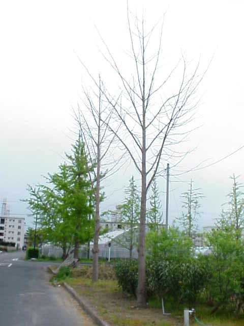 昨年12月9日の日記で、農学部農場内に葉の落ちない銀杏が1つだけあると書いた(写真左)。不老不死のミュータントかとも思ったが、じつはその逆だったようだ。4/24の朝の時点で撮影した写真がこちら。よく見ると幹の下のほうの枝からはわずかながら新芽が出ているが、上部はどうやら枯れてしまった模様。となると、昨年12月の時点ですでに樹勢が衰えていて落下を促進する働きが機能しなかったために葉が残ったという可能性が高い。死ぬ前に一世一代の花を咲かせたといったほうが感動的ではあるけれど...。
