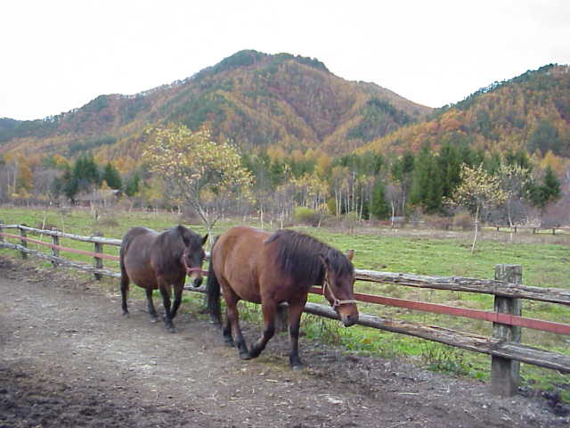 開田高原に着いたのは16時ちょっと前。馬に乗ってトレッキングという妻の希望も残念ながら叶えられず。馬たちはすでにねぐらに戻るところだった(写真左下)。