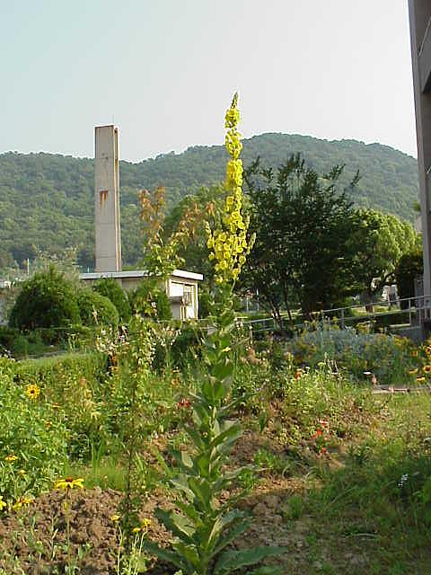 最初の写真は、文学部の西出入り口前にある花壇。画面中央の黄色い花はビロウドモウズイカ(すぐ近くの空き地で野生化している種類よりも花がたくさん付いているのであるいは別種か園芸品種かも)、よく見ると他に、白蝶草やルドベキアが咲いている。この日記で毎日紹介している花の写真の中にはこの花壇で撮影したものが数多く含まれている。当然のことながら、ここは私の花壇ではなく国有地だが、環境整備作業などという名目で、時折、処分品のポット苗を花屋から買ってきて植えたり、雑草取りをしている。この花壇のもうひとつの魅力は、半田山が借景になっていることだ。ちなみに、景観上は目障りなコンクリートの煙突はボイラー室。