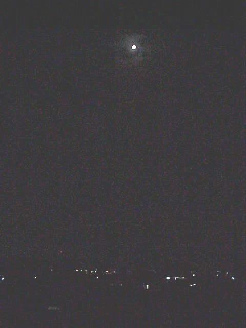 で、実際だが、宵のうちは雲がかかって月の位置を確かめることさえできなかった。その後夜中に目が覚めたところ、月明かりが部屋の中まで差し込んでいたのでベランダに出てとりあえず一枚。真っ暗ながら、地上の明かりとの位置関係を把握する資料にはなると思う。 余談だが、来月7月16日は20時57分から翌日の0時54分にかけて皆既月食が見られる。この月食は、月が地球の本影のほぼ中心を通るため、皆既食の経過時間が1時間47分にも達するという点だ。ふつう皆既月食になっても、赤っぽい月の輪郭が見えているはずだが、本影中心に達した時には相当暗くなるものと予想される。 この時間帯に月面に立てば、地球に隠された太陽からの壮大なコロナが眺められるはずである。また、これだけ長時間太陽光が当たらないと、月表面の温度も相当程度に低下するのではなかろうか。 もうひとつ、この月食の最中、暗い月のすぐ近くに小惑星ベスタが見えるという。明るさは5.4等級ということなので、双眼鏡が必要。小惑星そのものはこの日以外でも見えるけれども、普通は他の星と区別ができないため、どれが小惑星なのか分からない。この日は皆既月食の終わり頃には約2度まで接近するということで、月の直径の4倍程度の円内でいちばん明るい星が右下に見えていれば間違いなくベスタということになる。晴れて欲しいところだ。 |