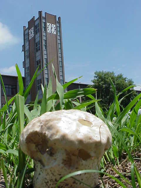 時計台前に出現したパン型のキノコ。脳茸の仲間ではないかと思われる。これとは別の場所には、ホンマに脳の形そっくりのキノコがあった(写真右)。なお、昨年、同じような写真を公開したところその翌日には丸ごと持ち帰った人が居た[昨年6月27日の日記参照]。この日記で知ったためなのか、独立して発見されたのか定かではないし、学術目的に採集された可能性もあるが、キノコを不必要に持ち帰る行為はヤメテもらいたいものだと思う。今年は、これを危惧して、この写真の公開を一週間遅らせた。左の写真は6/28撮影、右は7/1撮影のもので、7/5時点ではすでに胞子のかたまりとなって目立たなくなっている。 |