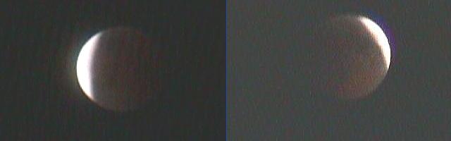 デジカメでとらえた皆既月食の様子。右は皆既食開始前の21時54分頃、左は皆既食終了後の23時58分頃。 |