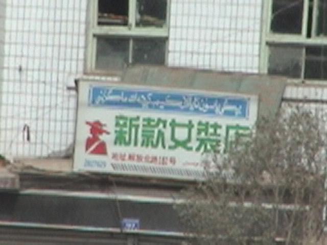 カシュガルで見た面白い看板(その2)。『新明解』では「女装」は「男が女の服装をすること」という意味になっているが、カシュガルにそういう人たちがたくさん居るとも思えない。これはやはり、女性の服を売っている店なのだろう。 |