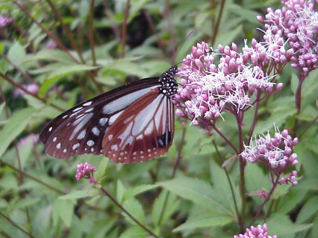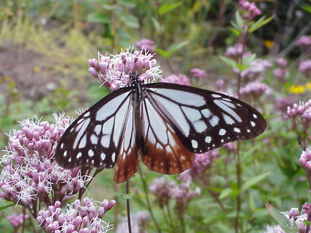 同じく、日曜日の話題になるが、昼過ぎ、大学の花壇でフジバカマの花の蜜を吸っている珍しい蝶を見つけた。デジカメで撮影しておいて家の図鑑で検索したところでは、アサギマダラというマダラチョウの仲間であることが判明した。それほど珍しい蝶でも無さそうだが、私にとっては初めての目撃となる。